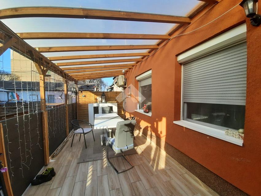 Az ingatlan előtt kb. 20 nm-es, fedett, lekerített teraszkapcsolat helyezkedik el.